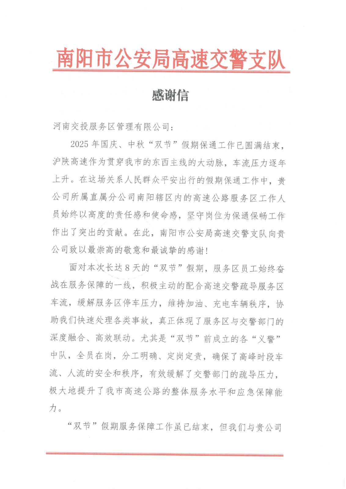 《一天內(nèi)連收兩封感謝信…》 “雙節(jié)”期間,面對(duì)假期車(chē)流人流驟增,公司所屬服務(wù)區(qū)科學(xué)部署、積極應(yīng)對(duì),圓滿完成安全…